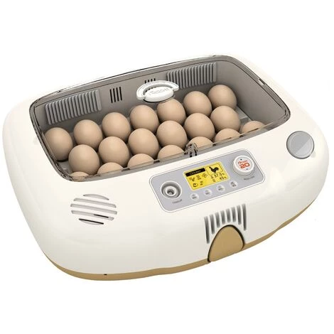 Couveuse automatique avec capacitĂ© pour 20 Ĺ“ufs de poule, 12 Ĺ“ufs de canard, 6 Ĺ“ufs d’oie, 30 Ĺ“ufs de perdrix ou 40 Ĺ“ufs de caille.