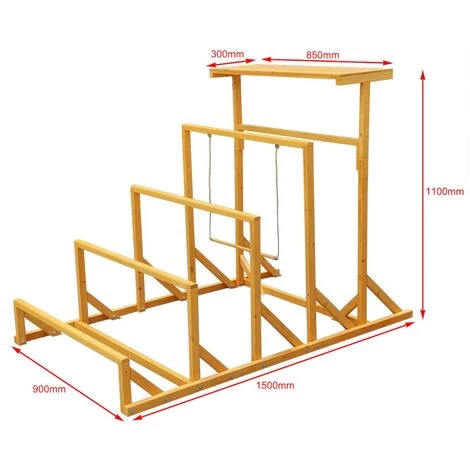 Aire de jeux et d’exercice avec balançoire destinĂ©e Ă vos poules et volailles. Dimensions hors tout : L. 150 x l. 90 x H. 110 cm Bois d’EpicĂ©a finlandais 4 perchoirs 1 plateforme 1 balançoire.