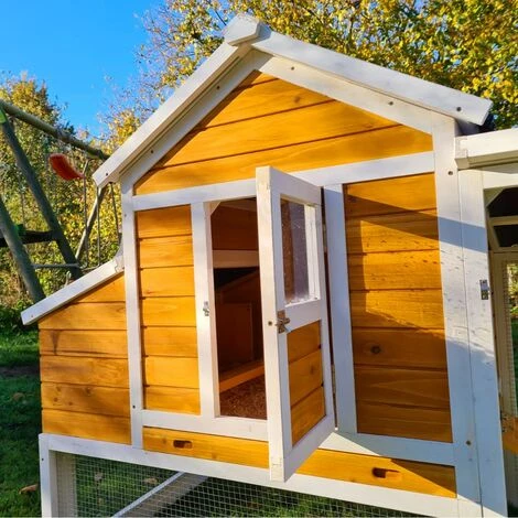 Installez confortablement jusqu’Ă 8 poules dans ce très joli poulailler, pratique et esthĂ©tique. Il est muni d’un parc grillagĂ© et son toit est en plastique ondulĂ©, matière parfaitement Ă©tanche.  Un poulailler colorĂ© très design Le jaune dorĂ© et le blanc de ses façades offrent un contraste important avec le gris anthracite de son toit et son dessin n’est pas sans rappeler le design scandinave. Ses lignes simples et ses couleurs chaudes Ă©voquent en effet des photos de villes et villages suĂ©dois ou norvĂ©giens. Son aspect très dĂ©co en fera une pièce de choix dans votre jardin. Notez que les plus jeunes, tout comme les plus âgĂ©s d’ailleurs, seront enchantĂ©s de pouvoir observer des poules dans leur environnement grâce aux larges panneaux grillagĂ©s.  Accueillez jusqu’Ă 8 poules dans cette maisonnette très pratique En plus d’ĂŞtre très joli, le Toit RenforcĂ© est aussi bien conçu. Robuste, il est constituĂ© de panneaux de bois Ă assembler d’une Ă©paisseur de 12 mm, gage de qualitĂ© et de durabilitĂ©. Ses montants font quant Ă eux 25 x 30 mm. Son grillagĂ© est en mĂ©tal galvanisĂ©, prĂ©servĂ© de la rouille. Le tiroir Ă dĂ©jections, très pratique pour l’entretien du poulailler, est Ă©galement en mĂ©tal galvanisĂ©. PlacĂ©e en hauteur, la partie nuit est ainsi mieux isolĂ©e du froid et de l’humiditĂ© du sol. Vos poules y grimperont Ă l’aide d’une rampe en bois et trouveront Ă l’intĂ©rieur deux perchoirs ainsi qu’un pondoir sĂ©parĂ© en trois accessible de l’extĂ©rieur.  Du plastique ondulĂ© pour une toiture totalement Ă©tanche L’abri Ă volailles est couvert de plusieurs toitures Ă dĂ©bords, toutes en pentes afin de rendre l’Ă©coulement de l’eau de pluie plus facile. Le plastique ondulĂ© qui a Ă©tĂ© choisi est parfaitement Ă©tanche et gardera vos petites protĂ©gĂ©es bien au sec.  Des volailles plus libres avec un parc grillagĂ© Vos pondeuses pourront prendre l’air, gratter et picorer le sol Ă loisir grâce au parc grillagĂ© intĂ©grĂ© au Toit RenforcĂ©. Elles y seront Ă l’abri de la pluie et des intempĂ©ries, mais aussi de toute intrusion. Elles investiront aussi la place libĂ©rĂ©e au sol par le placement en hauteur de la partie nuit. Vous complèterez idĂ©alement votre installation avec un filet ou un grillage Ă poules qui sĂ©curisera les abords du poulailler afin de proposer Ă vos bĂŞtes une zone protĂ©gĂ©e plus importante. Elles pourront y suivre leur parcours quotidien. Â