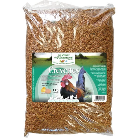 Mini crevettes (gammares) lyophilisées. Délicieux complément alimentaire pour vos volailles et canards, elles sont de précieuses aides à l’élevage des jeunes, en particulier des canetons.