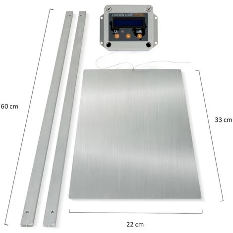 Descriptif de la porte automatique pour poulaillerOffrez sĂ©curitĂ© et protection pour votre Ă©levage avec le kit d’accès automatique pour poulailler. Conçu contre les prĂ©dateurs, le kit permet une ouverture et fermeture automatique et Ă distance de la trappe d’accès du poulailler. Facile Ă installer, il suffit de fixer le boĂ®tier sur votre poulailler et de connecter le cordon Ă la porte. Grâce Ă l’Ă©cran LCD intĂ©grĂ© au programmateur, vous pourrez utiliser très simplement les diffĂ©rents modes. Ouvrez la porte le matin et fermez-la le soir en programmant les horaires souhaitĂ©s ou choisissez une ouverture et une fermeture en fonction de la luminositĂ© extĂ©rieure. Avec un tel système, vos poules seront en sĂ©curitĂ© une fois rentrĂ©es dans leur abri et vous n’aurez pas besoin d’aller quotidiennement leur ouvrir la porte ou les faire rentrer. FabriquĂ©es en aluminium, la porte ainsi que les barres latĂ©rales sont rĂ©sistantes et ne bougeront pas dans le temps. Le boĂ®tier (programmateur) en ABS fonctionne avec 4 piles AA (non incluses). Ce kit automatique complet vous permet de tenir vos poules Ă l’abri des prĂ©dateurs tout en leur offrant de la libertĂ©. Afin d’optimiser leur sĂ©curitĂ©, la porte est Ă©quipĂ©e d’un mode anti-fermeture qui annule la descente de la trappe si la prĂ©sence d’une poule est dĂ©tectĂ©e. Vous pouvez Ă©galement intervenir Ă tout moment en utilisant le bouton manuel situĂ© sur le boĂ®tier. Dimensions du kit complet pour poulailler- Dimensions de la porte : largeur 22 cm x Hauteur 33 cm- Hauteur des barres latĂ©rales : 60 cm- CapacitĂ© de levage de la porte : 1,2 kg- Dimensions totales du boĂ®tier : Longueur 14 cm x profondeur 7 cm x Hauteur 10 cm- Programmation horaires ou luminositĂ© ou mixĂ©e : 1. heure d’ouverture – heure de fermeture2. luminositĂ© d’ouverture – luminositĂ© de fermeture3. heure d’ouverture – luminositĂ© de fermeture4. luminositĂ© d’ouverture – heure de fermeture- Bouton manuel externe- Fonction d’auto-vĂ©rification Ă la première utilisation- Fonction d’ouverture et de fermeture manuelle de la porte.- RĂ©glage de la hauteur d’ouverture de la porte.