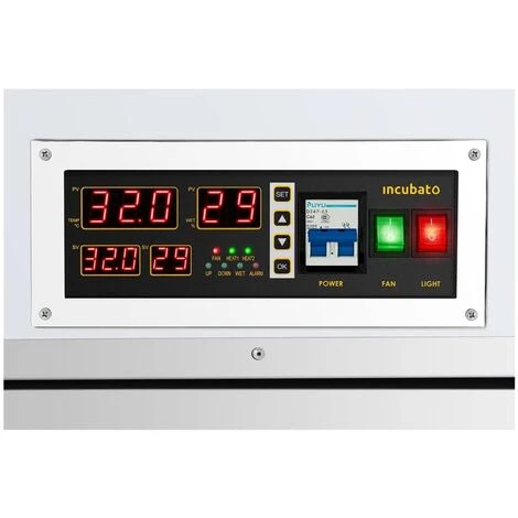 Cette couveuse incubato est dotée d’un boitier en métal robuste dans lequel vous pouvez placer jusqu’à cinq plateaux contenant des œufs d’oiseaux d’élevage. Elle dispose d’un panneau de commande simple avec quatre afficheurs LED, lequel permet de régler la température et l’humidité avec précision et en tout confort. L’intervalle de retournement peut lui aussi être paramétré en accord avec vos préférences. Tous les paramètres choisis sont mis à exécution de façon entièrement automatique par la couveuse professionnelle. Grâce au mire-œuf fourni, il est possible de contrôler le développement des oisillons. Une fenêtre dans la porte permet d’inspecter l’intérieur de la couveuse sans l’ouvrir. Atteignez un taux d’éclosion imbattable ; optez pour une couveuse automatique incubato !