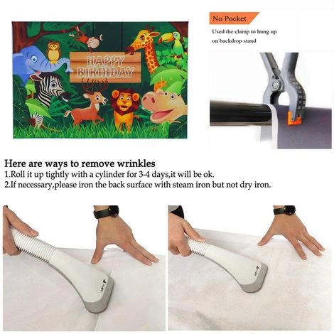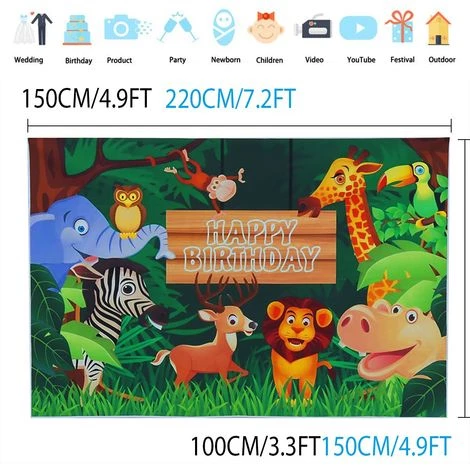 Equipement: 1X photographie toile de fond  Spécifications techniques: Thème: Jungle Safari Animaux à thème Couleur principale: vert Matériel: vinyle (réutilisable, non lavable) Taille: 150 * 100CM / 4.9 * 3.3FT 220 * 150CM / 7.2 * 4.9FT  Caractéristiques et avantages: ★ Matériel: toile de fond en vinyle mince (tissu de photographie professionnel) ★ Taille: 220 * 150CM / 7.2 * 4.9FT; 150 * 100CM / 4.9 * 3.3FT, adapté à la photographie d’anniversaire ★ Caractéristiques: Haute résolution, Imprimé par ordinateur, Fondu pas facile, Fidélité des couleurs, Sens stéréo de l’effet artistique fort. ★ Emballage: 1x toile de fond pc, article envoyé par plié, le repassage à basse température de la surface arrière avec du fer à vapeur peut éliminer le pli. ★ Idéal pour fête d’anniversaire, fête d’anniversaire, enfants et enfants.  Comment puis-je accrocher cette toile de fond? 1.Utilisez du ruban adhésif transparent, collez-le sur le mur 2.Utilisez des clips pour le suspendre à votre support. 3.Utilisez des trombones ou des punaises pour le maintenir  Remarquer: 1. Veuillez autoriser une erreur de 1 à 3 mm en raison de la mesure manuelle. Assurez-vous que cela ne vous dérange pas avant d’enchérir. 2. La couleur peut avoir différents comme affichage de différence, les pls comprennent.
