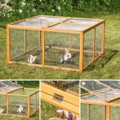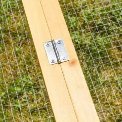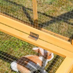 Cette clĂ´ture Ă roulement libre se compose d’une construction en bois en treillis qui peut ĂŞtre installĂ©e rapidement et facilement dans le jardin. Il est entièrement recouvert d’un toit qui peut ĂŞtre ouvert d’un cĂ´tĂ©, ce qui empĂŞche vos lapins de sauter dehors et sert Ă©galement de protection contre les prĂ©dateurs.