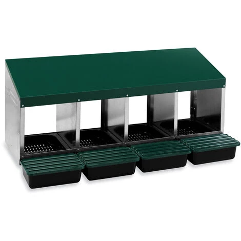 Pondoir équipé de 4 nichoirs avec fonds en plastique pour volailles. Dimensions : L106 x l52 x H48 cm Structure en métal galvanisé Fonds en plastique avec bacs de récupération Toit peint en vert Conçu pour être accroché à un mur ou monté sur des pieds Marque : Gaun