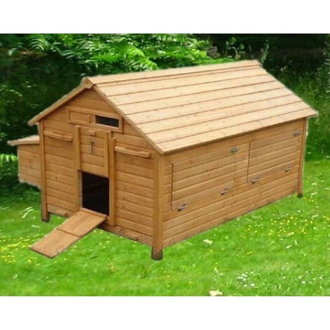 DĂ©couvrez le grand poulailler Challans, il sera parfait si vous recherche un abri Ă poules spacieux, très bien Ă©quipĂ© et Ă©volutif. En effet, vous pourrez complĂ©ter son Ă©quipement au besoin en ajoutant un ou deux pondoirs, un kit roulettes, un portier Ă©lectronique…  Un grand poulailler robuste pouvant recevoir une quinzaine de poules Le Challans est un modèle simple mais redoutablement efficace. Il est composĂ© de panneaux de bois Ă©pais de 12 mm, très simples Ă assembler. L’Ă©paisseur de son bois de qualitĂ© garantie une excellente protection de vos animaux contre le froid et les intempĂ©ries. Sa toiture en double pente permet un meilleur Ă©coulement de l’eau de pluie et ainsi une meilleure isolation de la partie nuit.  Un abri Ă volailles possĂ©dant de nombreux accessoires Il est montĂ© sur quatre pieds, ce qui a pour effet d’Ă©carter la plateforme principale du sol et de son humiditĂ© et donc d’amĂ©liorer encore l’isolation de l’intĂ©rieur. Ces pieds sont recouverts de capuchons de plastique qui empĂŞchent les infiltrations dans les montants de bois Ă©pais (25 par 30 mm). Les volailles accèderont Ă la partie Ă l’aide d’une rampe et y trouveront 4 grands perchoirs oĂą elles pourront s’installer. Vous accèderez facilement Ă cette partie grâce Ă la grande porte qui se trouve Ă l’arrière du Challans. Le large pondoir, sĂ©parĂ© en 4 zones de nidification oĂą vos pondeuses se relaieront pour pondre, est accessible de l’extĂ©rieur pour une rĂ©colte facilitĂ©e. Notez qu’un tiroir Ă dĂ©jections en mĂ©tal galvanisĂ© vous facilitera grandement la corvĂ©e de nettoyage. Couvrez-le de litière ou bien de papier journal pour que son entretien soit très rapide.  Un Ă©quipement que vous pourrez facilement complĂ©ter Pratique et Ă©quipĂ© de nombreux accessoires, le Challans est de plus personnalisable de plusieurs manières. Il est d’ailleurs proposĂ© en trois finitions : toit bois (celui-ci), toit en shingle noir et toit en shingle vert. Ajoutez des pondoirs pour recevoir plus de bĂŞtes Vous constaterez que des emplacements sont prĂ©vus pour pouvoir ajouter jusqu’Ă deux pondoirs supplĂ©mentaires (rĂ©f : C-5078E) sur le cĂ´tĂ© qui n’en possède pas encore. Vous dĂ©cuplerez ainsi votre capacitĂ©. Rendez votre poulailler mobile Un kit roulettes (rĂ©f : KITROUEL) très simple Ă installer rendra votre poulailler très facilement transportable. Ses poignĂ©es de portage situĂ©es sur les faces avant et arrière seront alors très utile pour le manipuler. Automatisez l’ouverture de sa porte Enfin, la porte de la partie nuit peut ĂŞtre Ă©quipĂ©e d’un portier Ă©lectronique. Il faudra dans l’idĂ©al remplacer la porte en bois par une trappe en mĂ©tal de taille M (rĂ©f : mHS-trappe) qui donnera de biens meilleurs rĂ©sultats couplĂ©e au portier. N’oubliez pas de protĂ©ger la zone qui se trouve tout autour de votre poulailler avec un filet ou un grillage Ă poules avant de les laisser gambader !