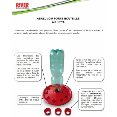 L’abreuvoir porte-bouteille pour poussins est facile à utiliser et s’adapte à tous les types de bouteilles disponibles sur le marché. Il peut être utilisé dans des petits troupeaux de 50 poussins maximum au cours des 6 premiers jours. L’abreuvoir à poussins est fabriqué dans une matière plastique soigneusement sélectionnée pour obtenir un produit de qualité, fonctionnel et flexible. Dans le choix des matériaux, River Systems se conforme à toutes les réglementations en vigueur concernant la protection de la santé animale et de l’environnement.L’abreuvoir est composé de deux parties distinctes, qui s’emboîtent l’une dans l’autre. Dans le disque supérieur, il y a un trou central sur lequel on peut fixer la bouteille. L’abreuvoir à poussins est fourni avec 3 adaptateurs, chacun ayant un diamètre et un filetage différents, qui conviennent à différents types de bouteilles en plastique.La taille des 10 trous dans lesquels les poussins boivent est telle qu’ils peuvent boire sans se mouiller ni tomber dans l’abreuvoir. De plus, les bords sont arrondis et finis pour éviter que les animaux ne soient blessés.La bouteille peut être remplie en la tirant hors de l’auge avec l’insert ou en la dévissant.Ce produit a été conçu pour accélérer les opérations habituelles d’approvisionnement par l’éleveur, ce qui permet d’économiser du temps et des ressources, et en même temps de permettre aux animaux de se désaltérer facilement dans un contexte de santé et de bien-être.