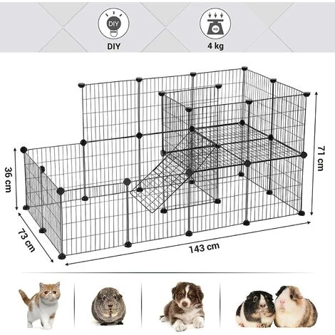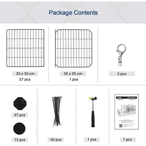 - L’ASSEMBLAGE EST UN JEU D’ENFANT: Il suffit de connecter les 27 panneaux grillagĂ©s mĂ©talliques et 1 porte Ă l’aide des 37 connecteurs. Et puis votre chien peut jouer danc ce parc spacieux