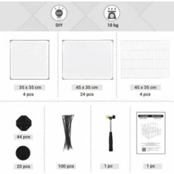 Durable et facile Ă nettoyerAvec des panneau en plastique polypropylène Ă©pais avec cadre mĂ©tallique robuste, il suffit d’essuyer la saletĂ© et les taches avec un chiffon humide. | Serre-câbles et patins antidĂ©rapantsDes serre-câbles maintiennent chaque joint plus fermement pour une structure stable. Des patins antidĂ©rapants protègent le sol des rayures. | Sans fenteLes coins du panneau ne prĂ©sente aucune fente qui pourrait faire que vos petits animaux de compagnie les mangent, s’y coincent les pattes ou s’enfuient. | Maillet utileLe maillet en caoutchouc inclus vous permet d’assembler cet enclos avec facilitĂ©. Vous pouvez le garder dans votre boĂ®te Ă outil pour une utilisation ultĂ©rieure. |