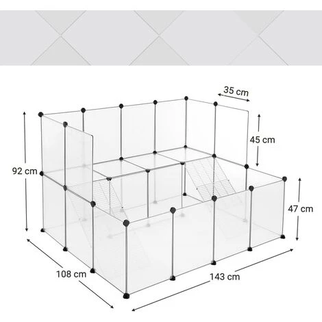 - COURS, COURS ! Cet enclos modulable avec balcon, escalier et terrasse deviendra certainement le nouveau paradis du jeu de votre petit animal de compagnie. Votre ami tout mignon pourra y courir Ă sa guise, sans que vous ayez Ă vous inquiĂ©ter qu’il puisse s’enfuir ou se blesser